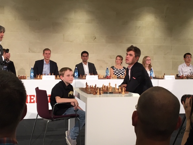 Bennet hat ja schon einige Superlative beim FTV aufgestellt: Erster Deutscher Meister im Verein, erster Teilnehmer bei einer Jugend-WM usw. Am vergangenen Wochenende konnte man der Liste einen weiteren Punkt hinzufügen – die erste Partie gegen Schachweltmeister Magnus Carlsen! Magnus trat einen Monat vor seinem WM-Kampf gegen Fabiano Caruana gegen 12 Spieler im Simultan in Hamburg an. Das Magazin „Der Spiegel“ stufte dabei in der Vorberichterstattung Bennet sogar als gefährlichsten Gegner für Magnus ein!