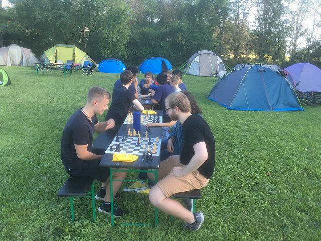 Nicht-schachliche Highlights sind dieses Jahr definitiv das Grillen am Samstag und die Pizza am Sonntag gewesen. Erstens, weil Essen glücklich macht und zweitens, weil das immer so ist, schon seit Jahren. Die Zelte überlebten auch dieses Mal durchweg den leichten Regen, den es in der ersten Nacht gab. Ansonsten war das Wetter so hervorragend wie Peters Partien und der Guten kann ja schon etwas Schach spielen. Hendrik, Philipp und Saskia, die hauptverantwortlich organisierten, sorgten auch 2019 für einen sehr gelungenen Ablauf und viel Freude bei allen Teilnehmern. Sicherlich wird auch 2020 ein Erlebnis werden, das alle bereichert und auf das wir uns bereits sehr freuen!