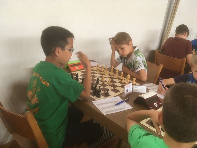 Was für den harten Kern der Erwachsenen bei uns das Turnier Untergrombach darstellt, finden die Jüngeren in Gernsheim. So ist diese wunderbare Veranstaltung, zu der wir jedes Jahr zum Zelten fahren, ein Muss für die Meisten unter 25 bei uns und auch ein paar Ältere zieht es als Betreuer mit dorthin, so zum Beispiel Saskia und Philipp, die schon seit gefühlten Ewigkeiten dabei sind. Bei der Spielstärke der Teilnehmer sah sich auch jede Gruppe vertreten. Vom blutigen Anfänger wie Zita über das triste schachliche Mittelmaß wie Robert bis zu FM Peter hatten wir alles dabei. Da unsere beiden Supertalente Bennet und Lucas leider auf Abwegen unterwegs waren und die Priorität der beiden die zeitgleiche Deutsche U12-Meisterschaft war, standen Jan, Dirk und Robert bereits früh unter Druck, Peter und Bao im A-Open für die Mannschaftswertung beizustehen. Hier konnte ein dritter Platz erreicht werden. Das ist neben dem dritten Platz Peters in der Gesamtwertung natürlich sehr erfreulich.