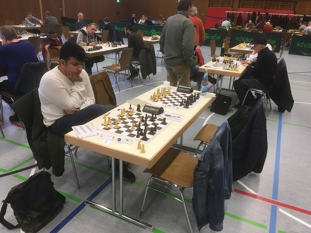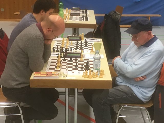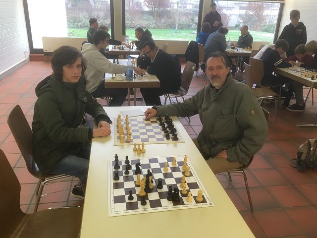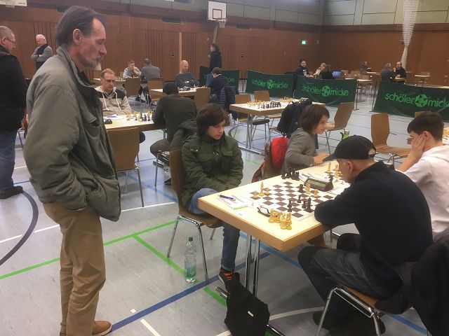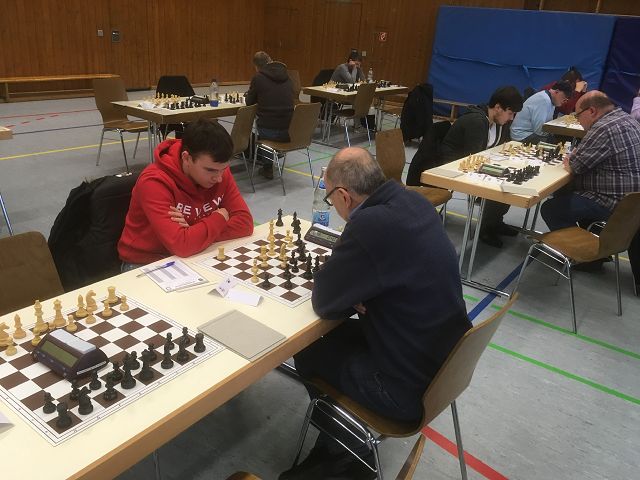 - e3 Sxe3 (Und Schwups war der Bauer weg. In der Folge opferte Dominik zwei weitere Bauern, um sich wenigstens im Nachhinein Kompensation für sein – Zitat – „Opfer“ im fünften Zug zu sichern. Danach stellte Schwarz einen Springer ein, konnte die Partie am Ende aber dennoch für sich entscheiden. Neben dieser Blüte des Schachsports sind noch die zwei vereinsinternen Duelle zwischen Dominik und Hendrik, Bao und Michi bzw. Uli und Nils zu nennen, da mal mehr und mal weniger ausgekämpft in einer Punkteteilung endeten. Viele Gesichter der vergangenen Jahre erkannten wir wieder, zu einem Klassiker kam es allerdings lediglich in der letzten Runde am Brett von Hendrik, welcher seinen Lauf hielt und hier sein sechstes Remis in Serie erzielen konnte. Eingang fanden wir auch in einen Zeitungsbericht, in dem unsere Verein als regelmäßiger Teilnehmer am Open von Untergrombach anerkennend erwähnt wurde.