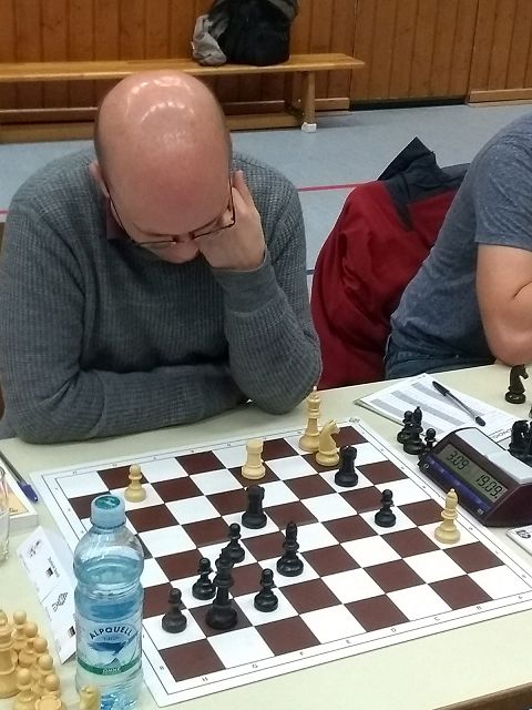Erwähnenswerte Partien waren neben Michis GM-Remis vor allem Dominiks Partie gegen einen 83jährigen Jüngling, die als „Die Meisterliche von Untergrombach“ in die Schachgeschichte eingehen wird. Dominik führte die weißen Steine (oder zumindest versuchte er es), eröffnete mit seinem üblichen Bird-Angriff und brachte im fünften Zug ein interessantes Bauernopfer aufs Brett: