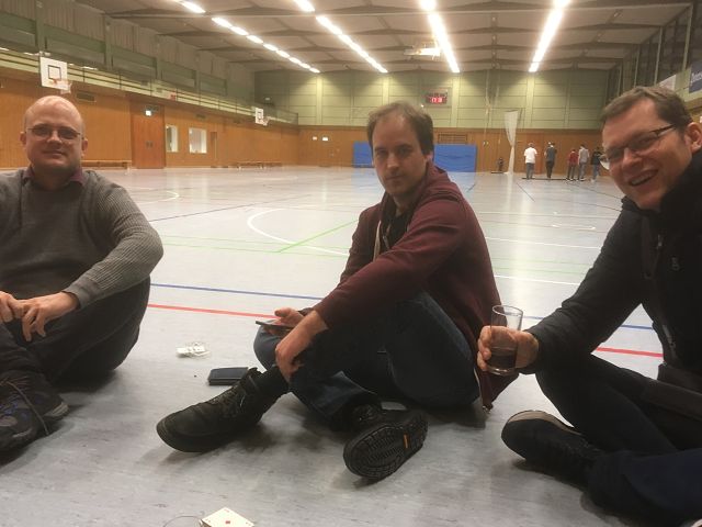 Wie zumeist auch in den vergangenen Jahren waren wir die Letzten in der Turnhalle, da der Zug immer auf eine feste Zeit gebucht werden muss. So kamen wir auch in den Genuss einer persönlichen Verabschiedung, den letzten übrigen Würstchen als Gratisverzehr (zu denen sich Bao galant noch Pommes dazu bestellte) und der letzten noch zu leerenden Flasche Spätburgunder. Der Turnierchef, Heiko Schleicher, ließ es sich nicht nehmen, Dominik mit den Worten zu verabschieden: „Das nächste Mal dann aber den richtigen Zug nehmen.“
