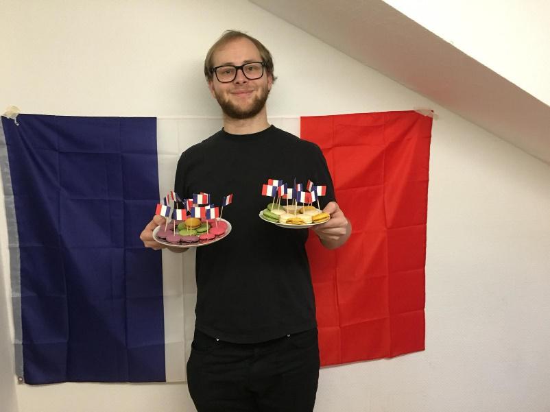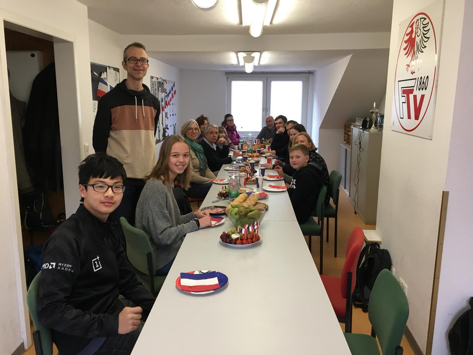 Mit diesem war es möglich, unseren Jugendlichen neben dem Europod-Austausch ein zweites Jahreshighlight zu ermöglichen, was unseren französischen Partner angeht. So trafen wir uns an einem Samstagnachmittag mit der Fechtabteilung in unseren Räumlichkeiten. Diese, besonders deren Betreuer des Frankreichaustauschs, Sonia und Erika sind uns mittlerweile sehr ans Herz gewachsen und so konnten wir uns alle auf diesen gemeinsamen Nachmittag freuen. Auf dem Programm stand als erstes ein französisches Buffet. Da ich bei der Organisation leider etwas optimistisch war und auf die Kraft der Jugend auch am Essenstisch zählte, welche etwas enttäuschte, blieb am Ende etwas über, aber das, was da war, machte alle satt und begeisterte enorm. Vor allem die Käseauswahl stieß bei den Kennern auf Freude und auch die Petit Fours Macarons begeisterten Groß und Klein, wie man an den Impressionen am Ende des Artikels sehen kann. Wie diese zeigen, war das Buffet 100 Prozent Frankreich-echt. Auch gab es viele Fahnen und weitere Deko, was für eine tolle Stimmung sorgte!