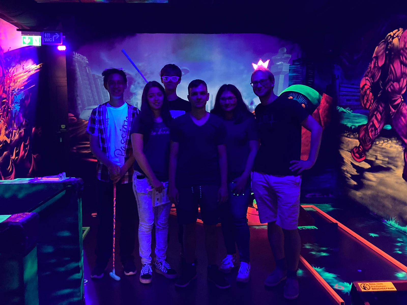 Um diesen Bericht nicht ausufern zu lassen: Die verschiedenen Herausforderungen kamen bei uns sehr gut an und auch unser Programm bereitete viel Spaß. Ob wir uns Masken bemalten, Tanzchoreographien elegant umsetzten oder auch nur Siedler von Catan spielten (es gibt übrigens sehr viele Ritterkarten in diesem Spiel, Grüße an Diba!), die Atmosphäre war ein Traum. Das mittlerweile traditionelle Europod-Grillen fand auch dieses Jahr statt, hinter unserem Verein und in bester Gesellschaft durch Steps n Styles. Etwas obskur wurde es beim Schwarzlichtminigolf auf der Berger: Hier versprach Robert als sehr erwachsener Betreuer, dem aktuell Führenden eine pinke Leuchtkrone zu verleihen. Da war den Teilnehmern noch nicht klar, dass er wochenlang geübt hatte und am Ende mit deutlichem Abstand triumphieren würde.