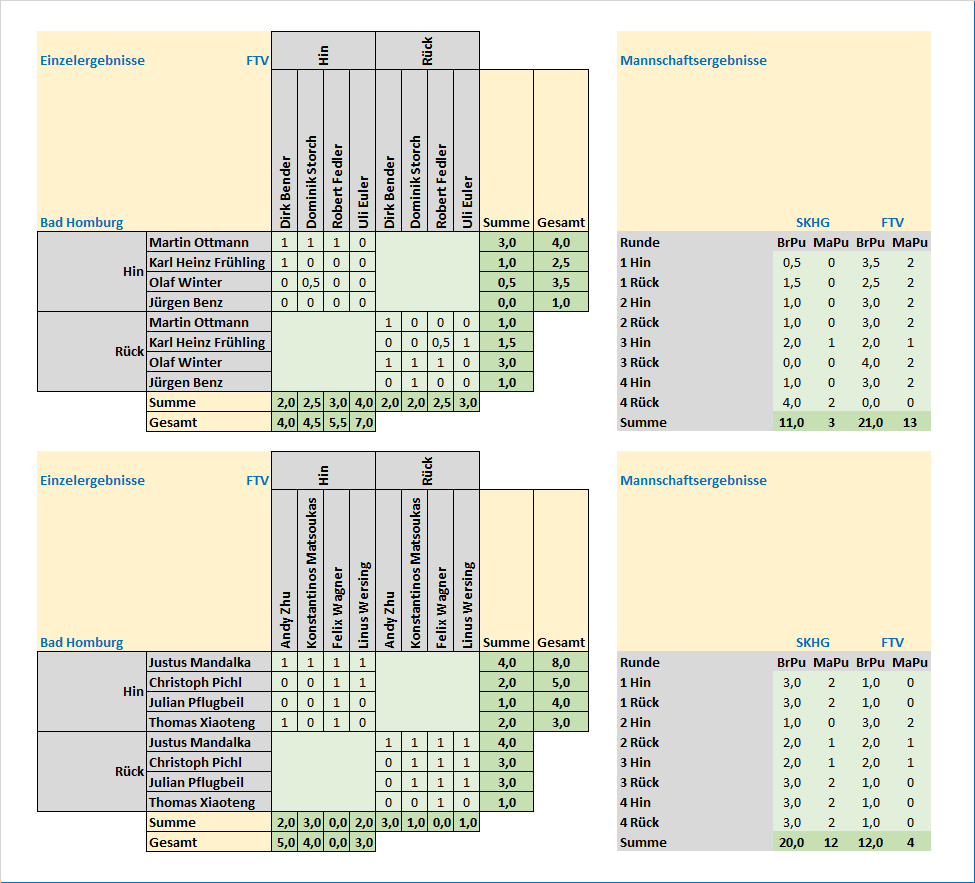Auf weitere Vergleichskämpfe dieser Art freuen wir uns bereits. So ist Coronazeit alles, aber keine schachfreie Zeit. Danke an Bad Homburg für die tolle Orga und auch die tollen Ergebnisgrafiken (s.u.), die spannenden Kämpfe und das faire Miteinander!