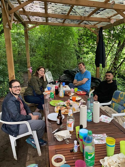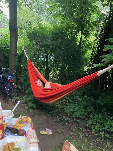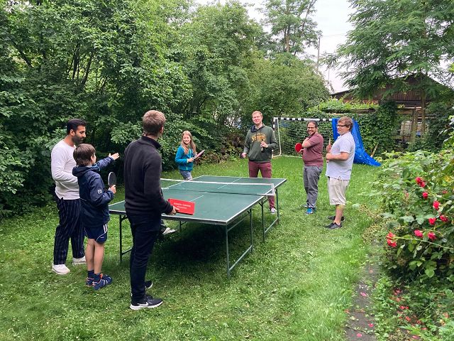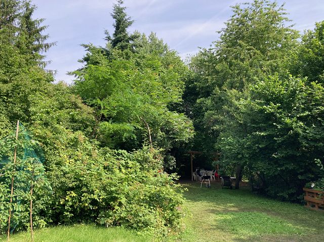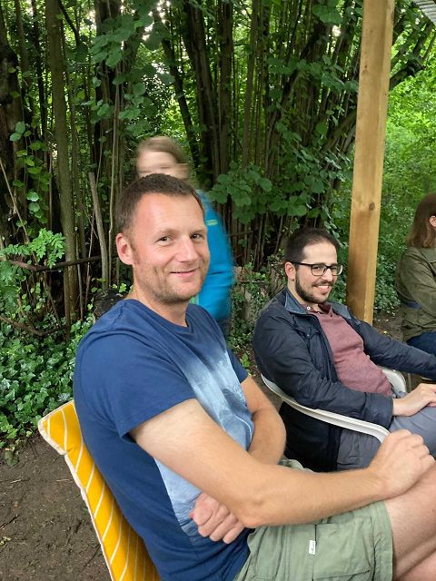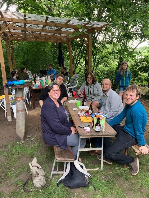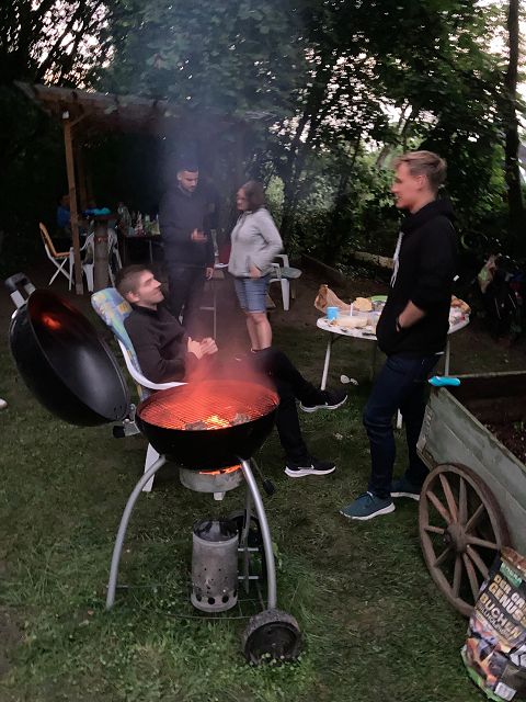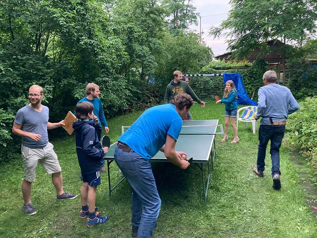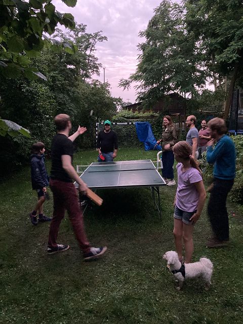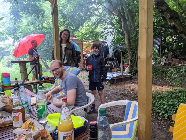 Immerhin, ab 19.00 Uhr war es dann für den Rest des Abends trocken, so dass die letzten noch später am Abend in der Dunkelheit bei Kerzenschein gemütlich zusammensaßen. Als updates im Garten im Vergleich zu den vergangenen Jahren machte sich eine Überdachung der Sitzfläche sowie ein selbst zusammengebasteltes Klosett positiv bemerkbar. Die anwesenden Kinder freuten sich über ein Trampolin und die Hängematte. Und die Tischtennisplatte erforderte zwar ein wenig Kraft beim Aufbau, erfreute dann aber jung wie alt beim Rundlauf.